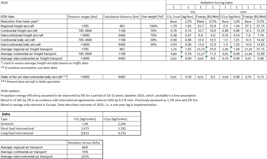 The below data is based on NTMCalc 4.0 and includes range based average aircrafts on a specified distance. The aircrafts are divided between regular freight aircrafts and belly aircrafts (passenger air crafts carrying additional cargo). The range based average aircrafts are a mix of reasonable aircrafts for different distances. The major update of these data refers to a shift towards use of more freighters due to severe reduction of passenger flights as a result of the Corona pandemic.
