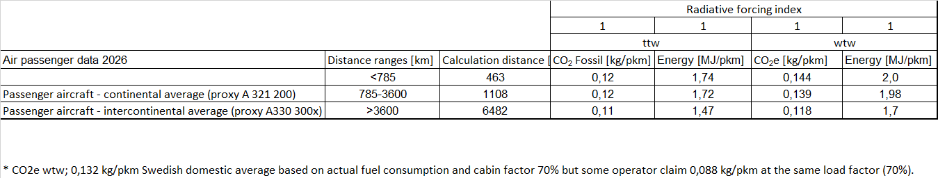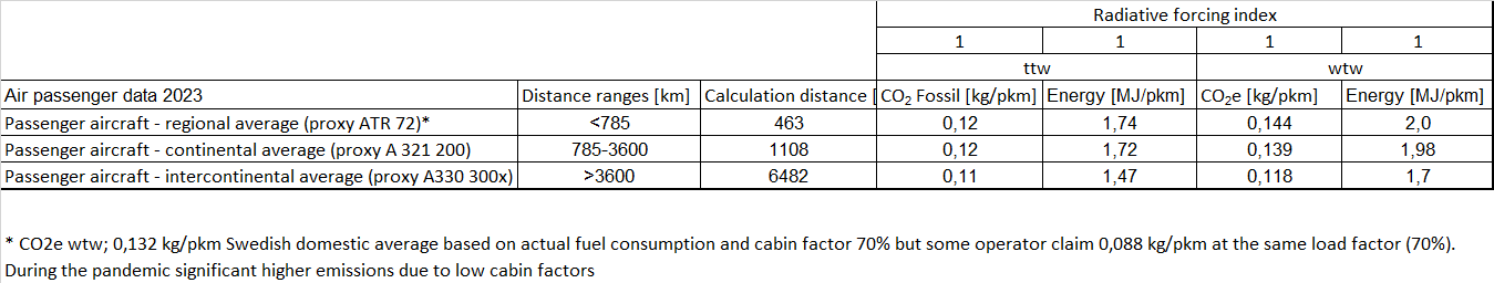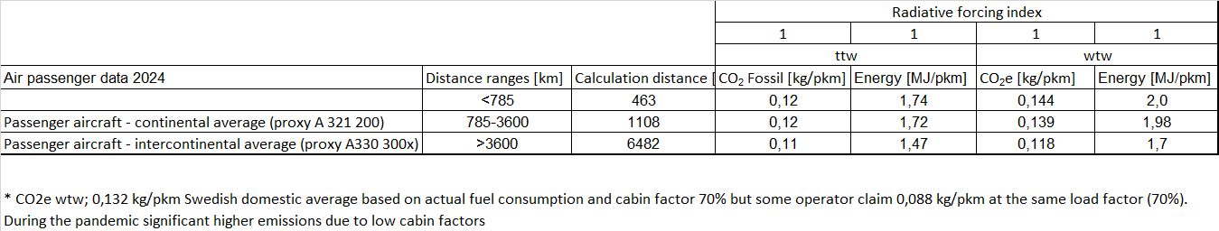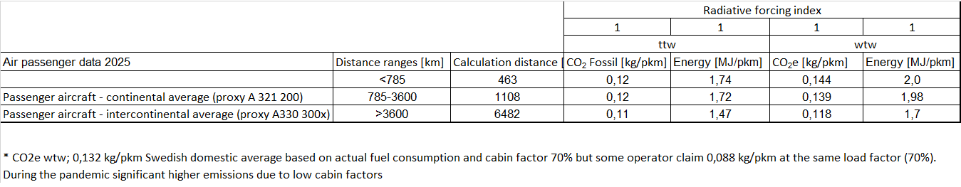 * The Swedish domestic average based on actual fuel consumption and cabin factor 70% gives CO2e wtw; 0,132 kg/pkm but some operator claim even lower GHG-emissions (0,088 kg/pkm at the same load factor of 70%). During the pandemic the emissions were significant higher due to low cabin factors.