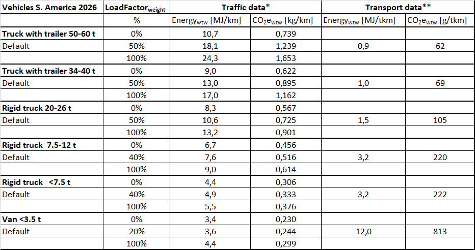 Performance in relation to vehicle operation expressed as emissions or energy use per ton * km. Useful if transport operation is carried out as a shared truck service. Default load factor [%-weight] includes empty positioning of truck.