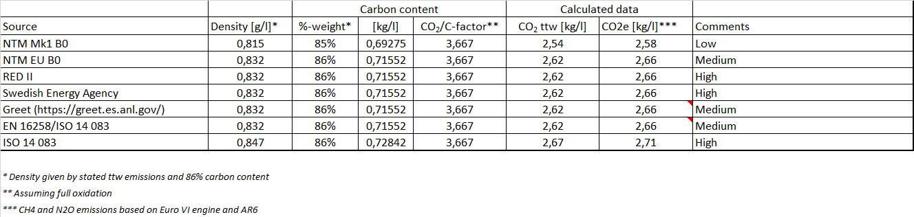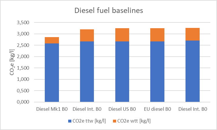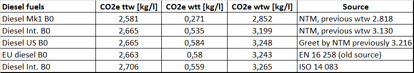 NTM data (MK1 and Diesel Int.) is still based on LCA-studies averages on production, but a factor of 10% for transport is added. This is in line with the JRC study stating 13 g/MJ in international production. The ISO 14 083 assumes a higher energy content and higher density which leads to a higher total emission factor. For international diesel a fair assumption of CO2e is 3,2 kg/litre.