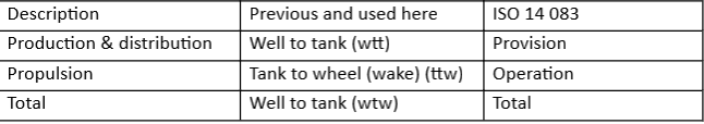 NTM continuously reviews various sources of life cycle assessment data (LCA) of diesel and other fuels. The aim is to ensure accurate and up to date baseline GHG-emission combustion in compression engines fuelled by fossil diesel The scope is primarily greenhouse gases, well to tank (wtt) and tank to wheel (ttw). In the ISO-standard 14 083 the wording is somewhat updated as described in below matrix.